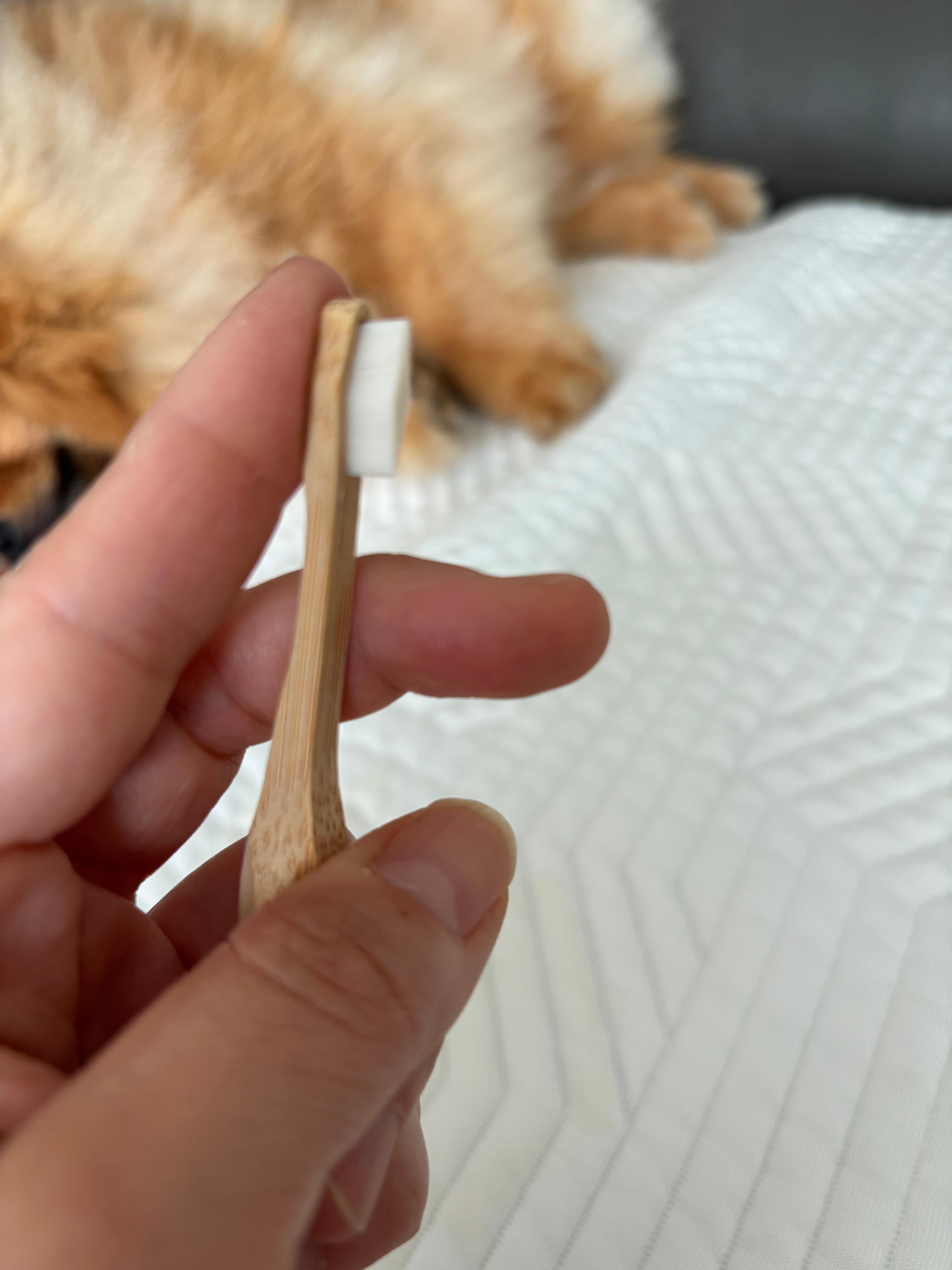 - 반려견 전용 칫솔과 치약을 사용합니다. (사람용 치약의 자일리톨 성분은 강아지에게 위험합니다!)